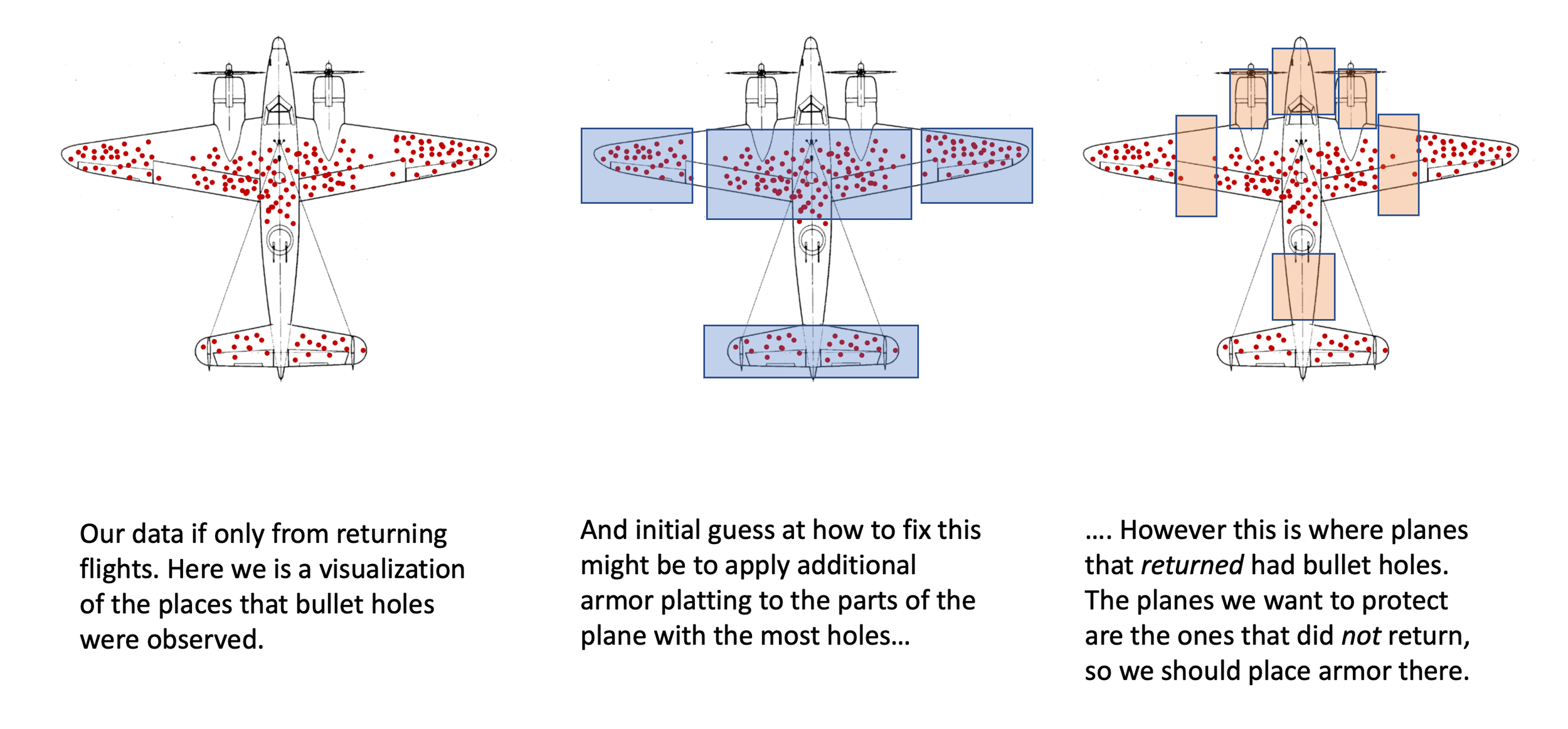 The classic survivorship bias problem: WWII analysts initially recommended reinforcing the areas of returning aircraft that showed the most bullet damage — until statistician Abraham Wald pointed out that they were only seeing the planes that made it back. The damage-free areas were exactly where the missing planes had been hit. We make the same mistake when we model our design process after the organizations whose stories get told, rather than the far larger number for whom that approach quietly failed.